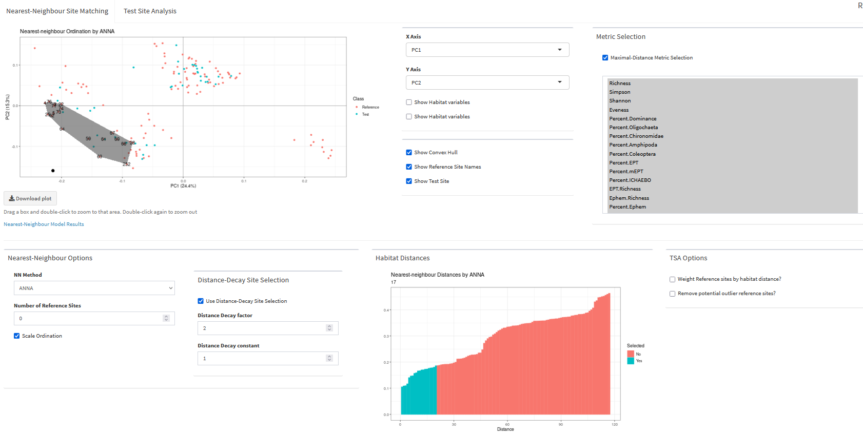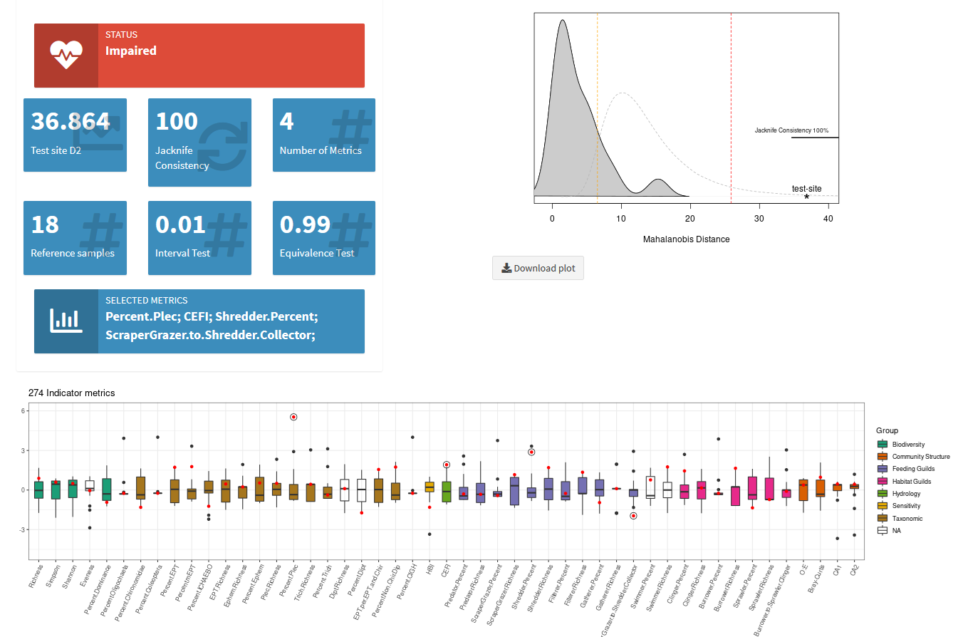 The Aquatic Ecosystem Assessment (AEA) Tool was developed in 2016. It provides an interactive dashboard and simplifies the complicated steps in performing aquatic ecosystem assessments using the reference condition approach (RCA). Users supply a table of benthic invertebrate community data, as well as relevant habitat data. The dashboard then calculated a wide array of summary metrics from the community data and provides a variety of visualization and transformation methods. If collection areas are identified as reference or exposed, a RCA can be performed using the Test Site Analysis (TSA) and Nearest-Neighbour site matching (NN). This dashboard provides many options for how these analysis can be performed, or provides heuristic algorithms for identifying suitable defaults. The final results are summarized using a series of informative graphics, ideal for visual story telling on the conditions of the aquatic community.