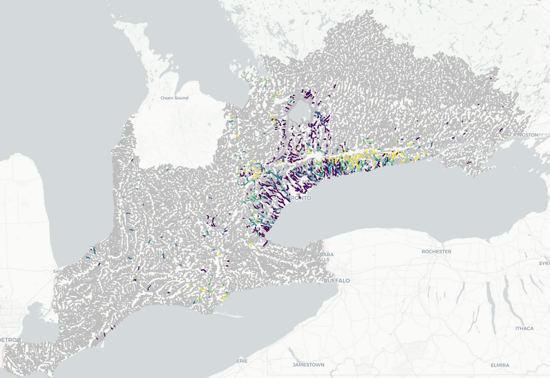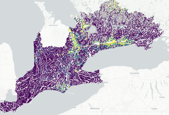 The goal of this project is to use data from Ontario’s Aquatic Ecosystem Classification (AEC) together with Flowing Waters Information System (FWIS) to develop predictive models of fish communities across Ontario. The biomass and density of 12 fish taxa are modeled using AEC variables, as well as landcover summaries from the Ontario Landcover Compilation (OLC). Landcover types were summarized into different groups, as well as a Landscape Disturbance Index (LDI), which quantifies the potential impacts of different landcover types to aquatic ecosystems. Predictions of current populations are available across all tributaries to the Great Lakes and St. Lawrence River.